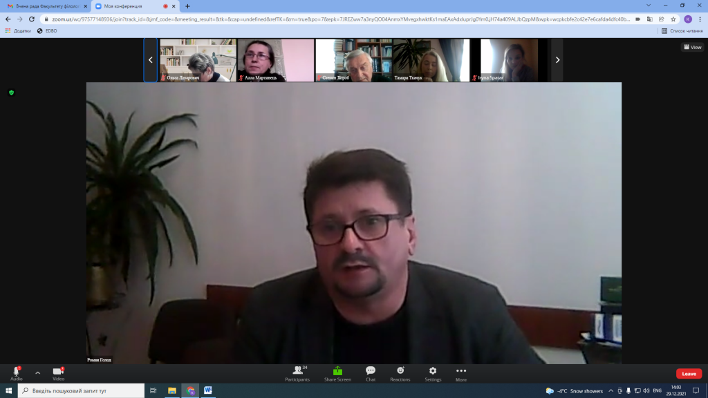 29 грудня 2021 р. відбулося підсумкове засідання Вченої ради Факультету філології. На засіданні слухалися питання: Підсумки науково-дослідної роботи кафедр та Факультету філології за 2021 р. Доповідали завідувачі кафедр; заступник декана Стецька І.В. Звіт про роботу ЕК та рекомендація до аспірантури Читати далі