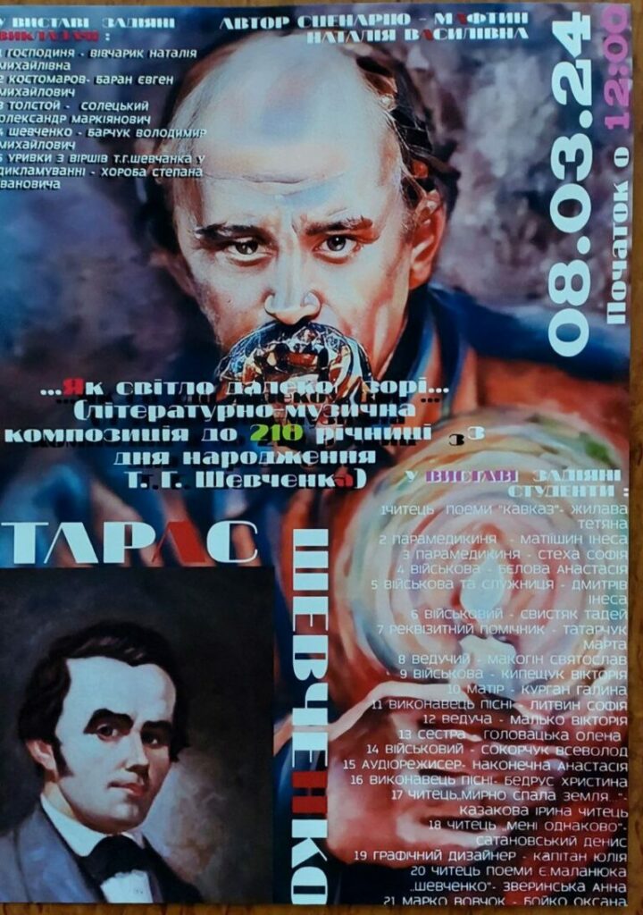 8 березня 2024 року на Факультеті філології з нагоди відзначення 210-річчя з дня народження Тараса Григоровича Шевченка відбулася літературно-музична композиція «…Як світло далекої зорі…». Ідейною натхненницею сценарію була докторка філологічних наук, професорка кафедри української літератури Наталія Мафтин. У виставі взяли Читати далі