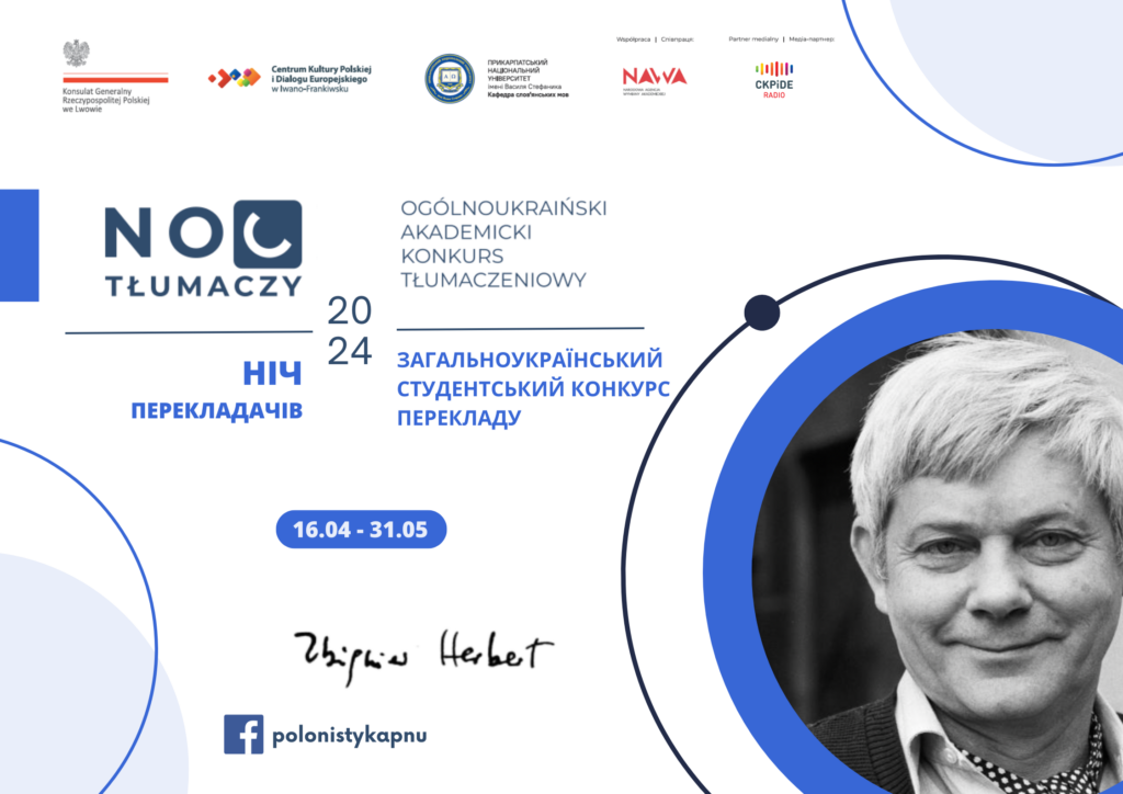 Шановні колеги! Запрошуємо Ваших студентів до участі y Всеукраїнському конкурсі на літературний переклад з польської мови НІЧ ПЕРЕКЛАДАЧІВ, який відбудеться під почесним патронатом Генерального Консульствa Республіки Польща у Львові 16 квітня – 31 травня 2024 року 2024 року. на базі Прикарпатського національного університету в Івано-Франківську. Читати далі