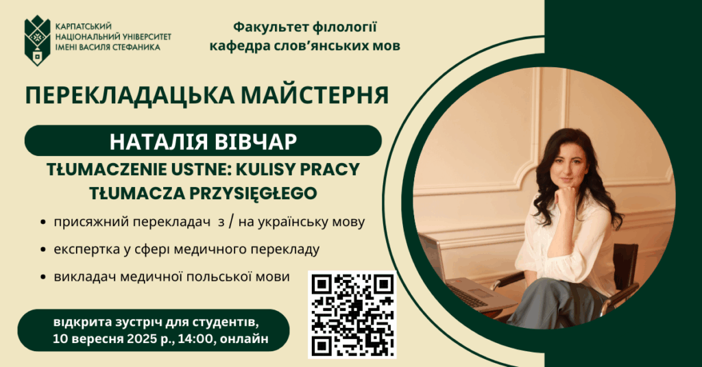 10 вересня відбулася перша відкрита лекція в 2025-2026 н.р. в рамках «Перекладацької майстерні», яку започаткувала кафедра слов’янських мов минулого року, де фахівці-практики діляться своїм досвідом зі студентами. У відкритій лекції взяли участь здобувачів 3-4 курсів ОР бакалавр ОП «Польська мова Читати далі